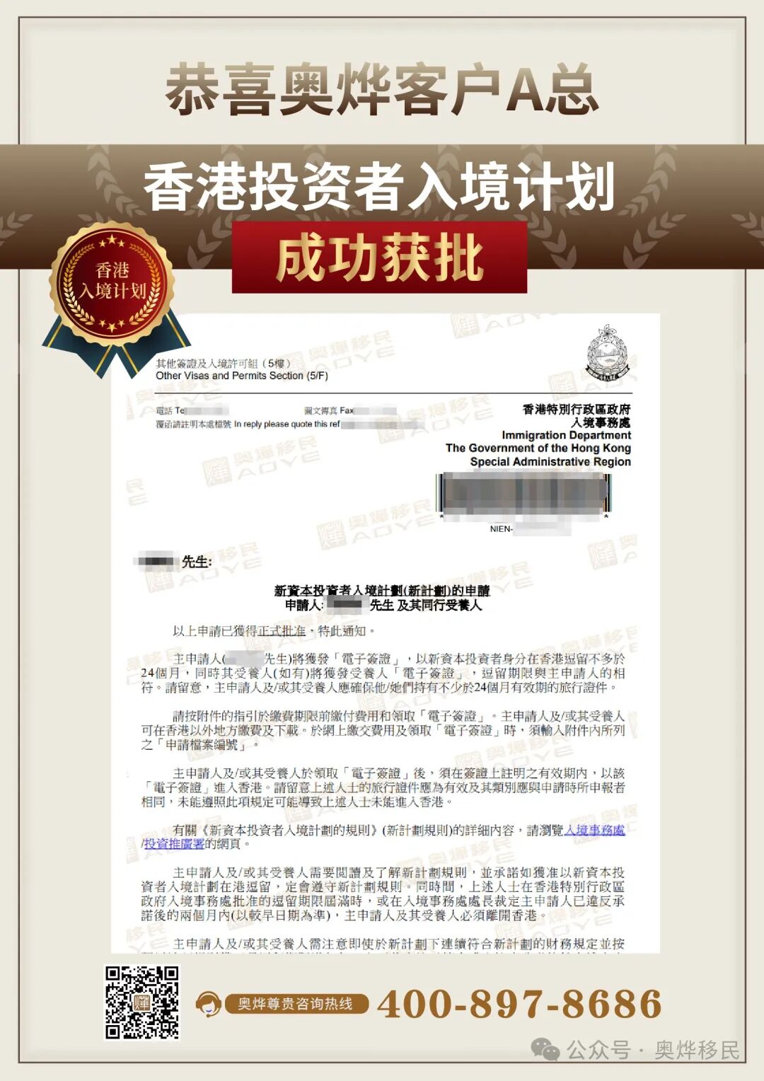 【奥烨捷报】祝贺香港新投资者入境计划A总,成功获批