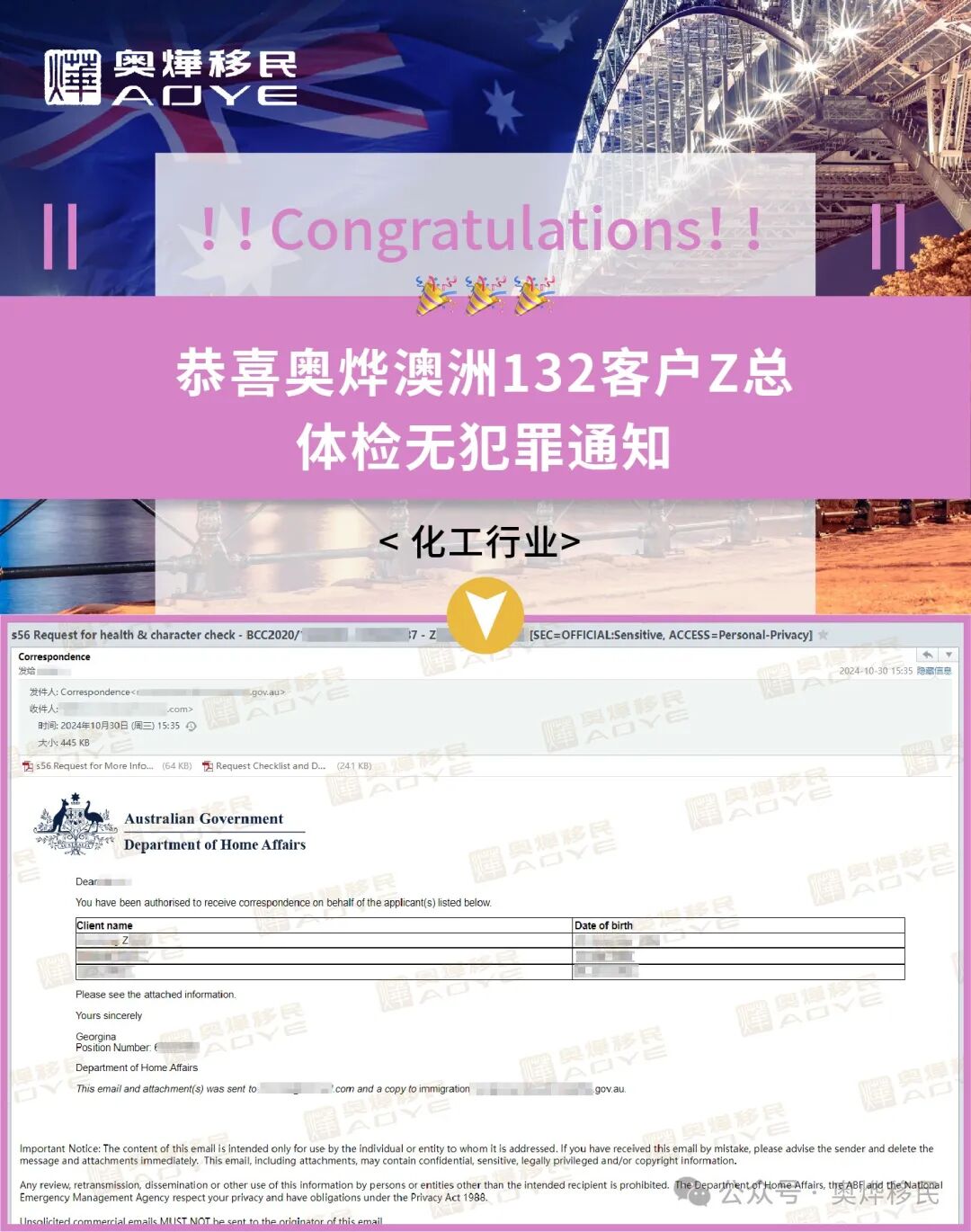 【奥烨捷报】祝贺澳洲132客户Z总,喜获体检无犯罪通知