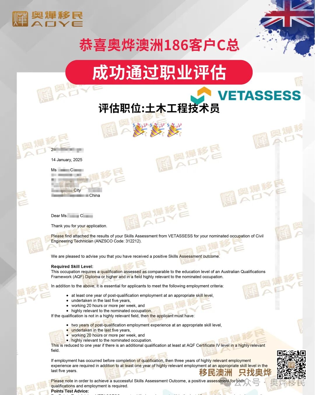 【奥烨捷报】祝贺澳洲186客户C总,成功通过职业评估