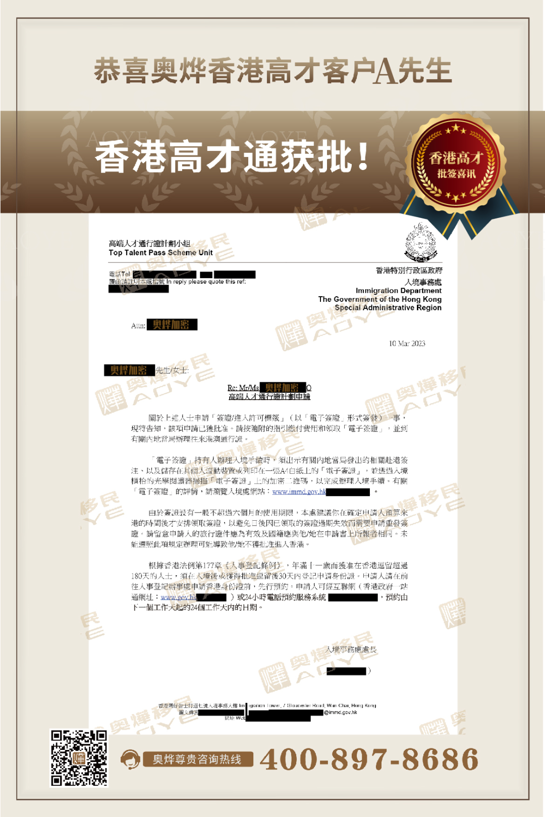 【奥烨捷报】祝贺香港高才通客户A先生,成功获批