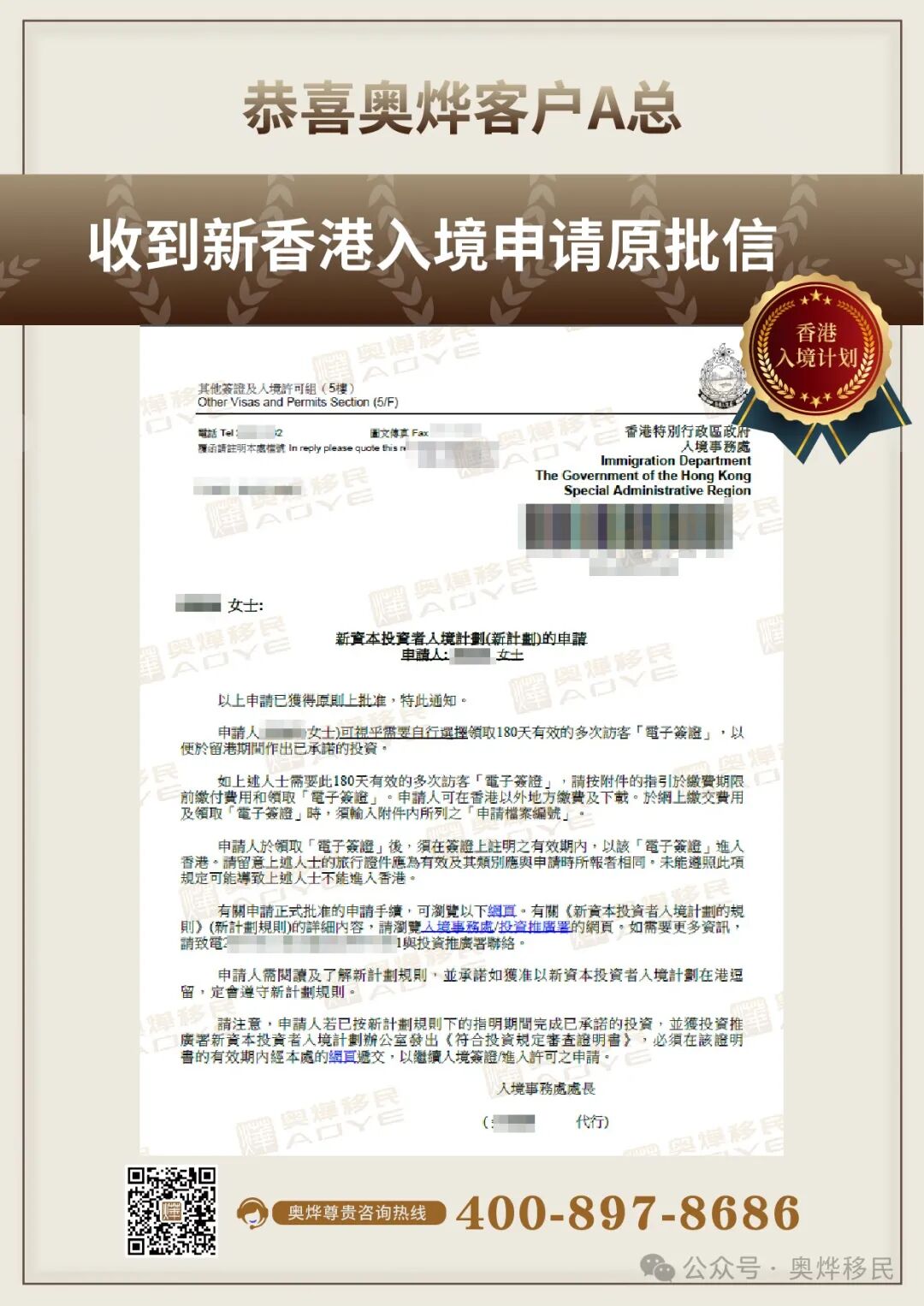 【奥烨捷报】耗时16个工作日,香港新资本投资者入境计划申请获批啦!