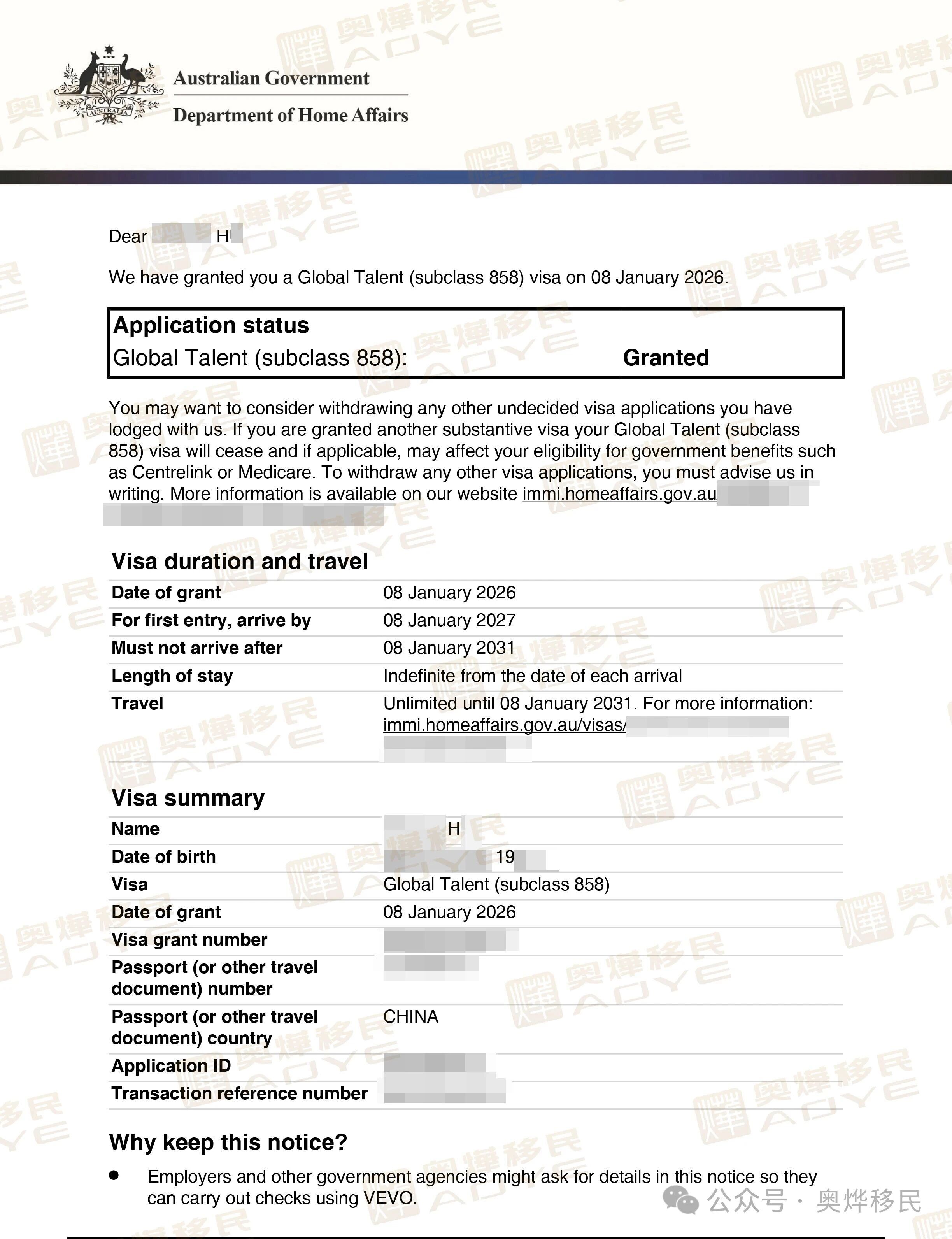 正是在这个紧要关头,奥烨中澳文案及律师团队凭借对政策的超强预判与高效执行力,全力协助来自文化产业的数字科技专家H总,完成了一次与时间赛跑的“末班车”申请,最终成功帮助其锁定澳大利亚永久居留资格。