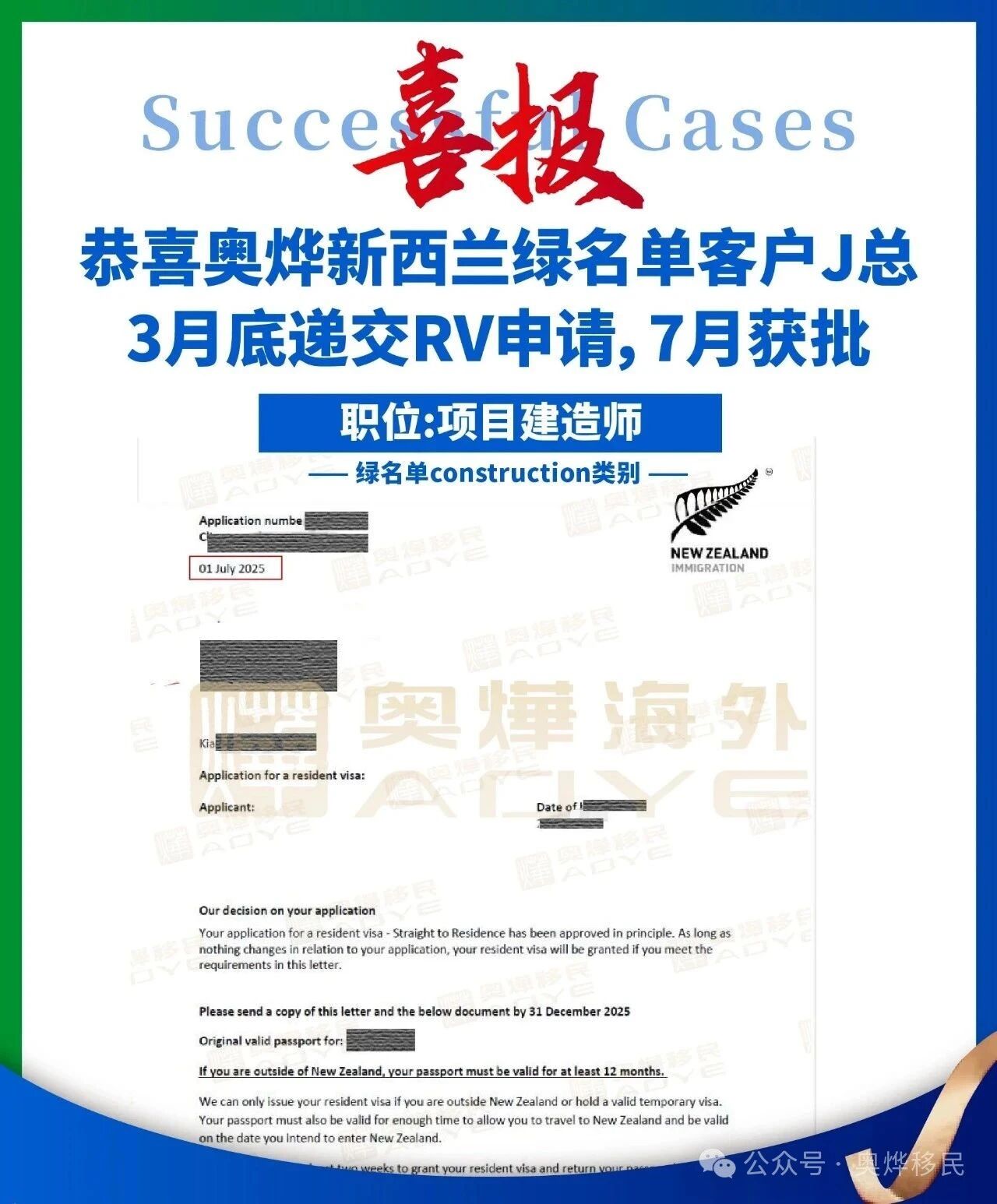 【奥烨捷报频传】新西兰绿名单客户J总,仅4个月批复RV