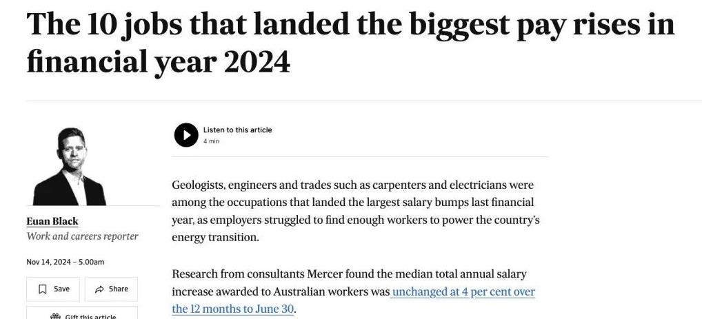 澳洲公布2024财年薪资涨幅蕞高的10个职业! 该数据基于近1300家澳大利亚公司(雇佣了超过 444,000 名员工)的数据。 澳洲媒体...